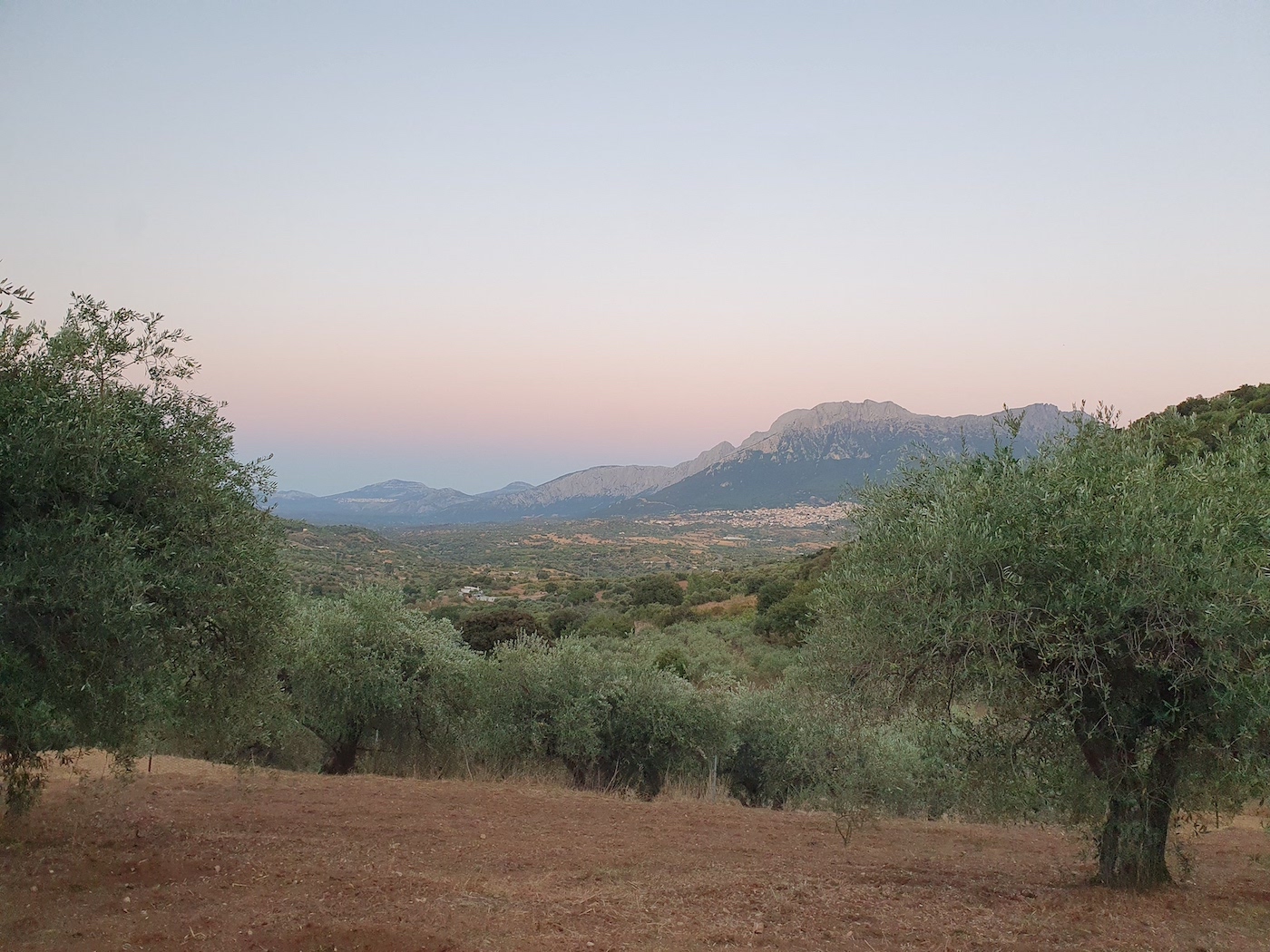 Olive trees and stone oaks in the foreground. Núgoro‘s wastewater treatment plant in middle distance and Núgoro‘s mountain, the Monte Orthobene in the back.