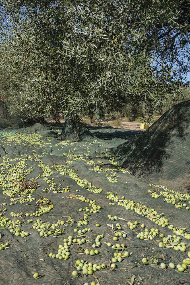 Nets spread out below olive trees in Donori for the manual harvest.